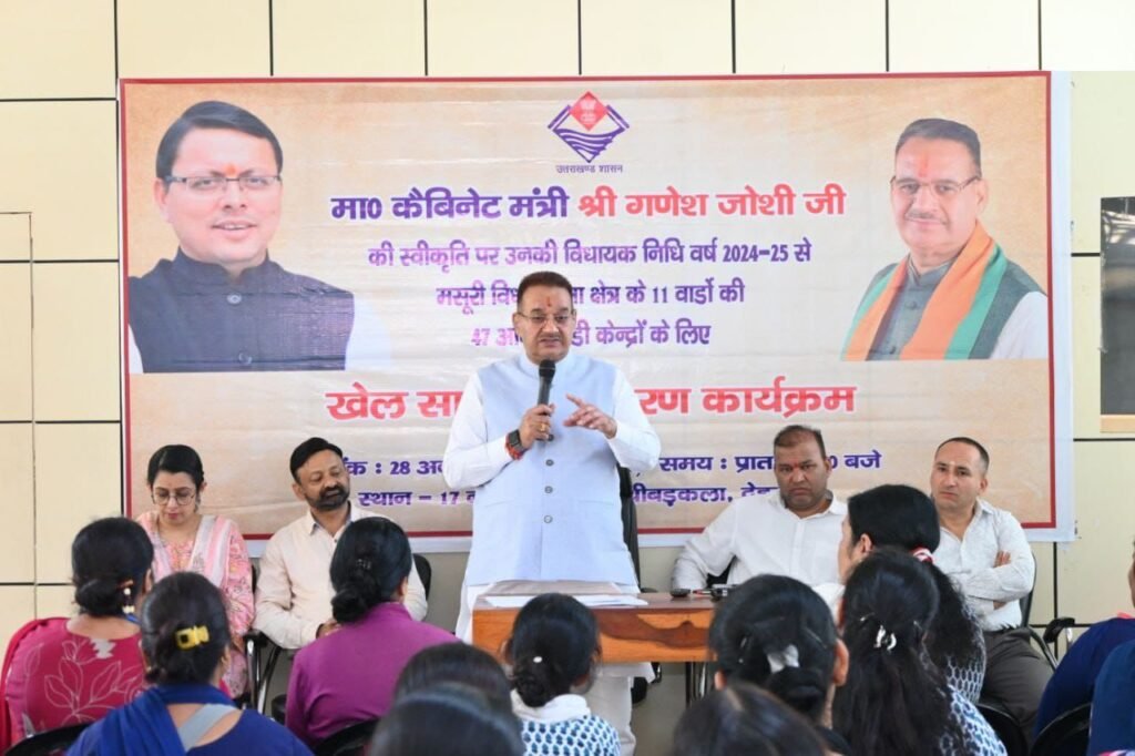 कैबिनेट मंत्री गणेश जोशी ने दीपावली के उपलक्ष्य में अपनी विधायक निधि से स्वीकृत निधि वर्ष 2024 – 25 से मसूरी विधानसभा क्षेत्र के 11 वार्डो की 47 आंगनवाड़ी केंद्रों के लिए खेल सामग्री वितरण कार्यक्रम में प्रतिभाग किया। इस दौरान उन्होंने विधानसभा क्षेत्र मसूरी आंगनवाड़ी केंद्रों के लिए पठन पाठन एवं खेल सामग्री वितरित किया। इस अवसर पर उन्होंनेथ आंगनवाड़ी केंद्रों हेतु पठन पाठन एवं खेल सामग्री पर आधारित विडियो का विमोचन भी किया।