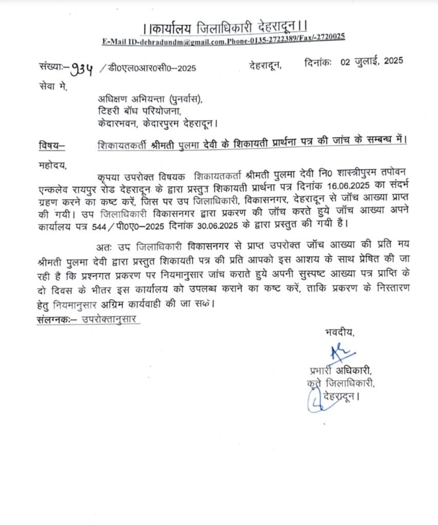 देहरादून 03 जुलाई, 2025(सू.वि.), जिलाधिकारी सविन बसंल भूमि फर्जीवाड़ा की शिकायतों पर सख्त रूख अपनाएं हुए हैं। विगत दिवस जनता दर्शन में शास्त्रीनगर तपोवन निवासी फरियादी पुलमा देवी ने अपनी शिकायत फुलसनी में 2007 में भूमि क्रय कि थी जिसकी रजिस्ट्री भी है, जो आवासीय भूमि टिहरी विस्थापित को आंविटत की गई थी, वर्ष 2020 में भूमि स्वामी द्वारा वही भूमि किसी अन्य को विक्रय कर दी। इस गंभीर एवं संदिग्ध प्रकरण पर डीएम ने जांच कराई। जून माह के द्वितीय जनता दर्शन में डीएम के संज्ञान में आया था पुलमा देवी प्रकरण।